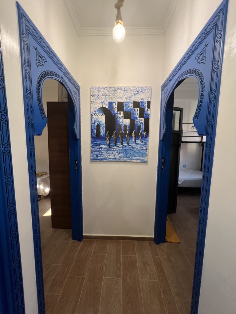 Blue Pearl Surf House offers a modern and comfortable space for surfers and travelers visiting Tamraght. Designed around a relaxed surf lifestyle, the house features bright rooms, shared spaces, and a rooftop terrace where guests gather after a day in the water.
